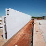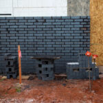 Construction crews start stacking the first courses of ICF wall. ICF blocks are stacked, with rebar being placed inside of the webs horizontally and vertically, the walls are then braced and straightened prior to the concrete pour.