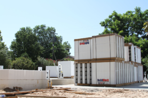 BuildBlock ICFs were delivered to the jobsite. After being delivered, the bundles of ICF are staged on the jobsite to be ready for the next step: forming the walls.