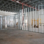 Metal framing is being installed for interior walls and exterior finishes are being applied.