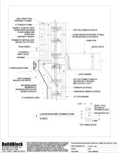 The following detail contains our 6 inch brickledge block in a ledger board connection on a lumber joist parallel to wall with masonry veener