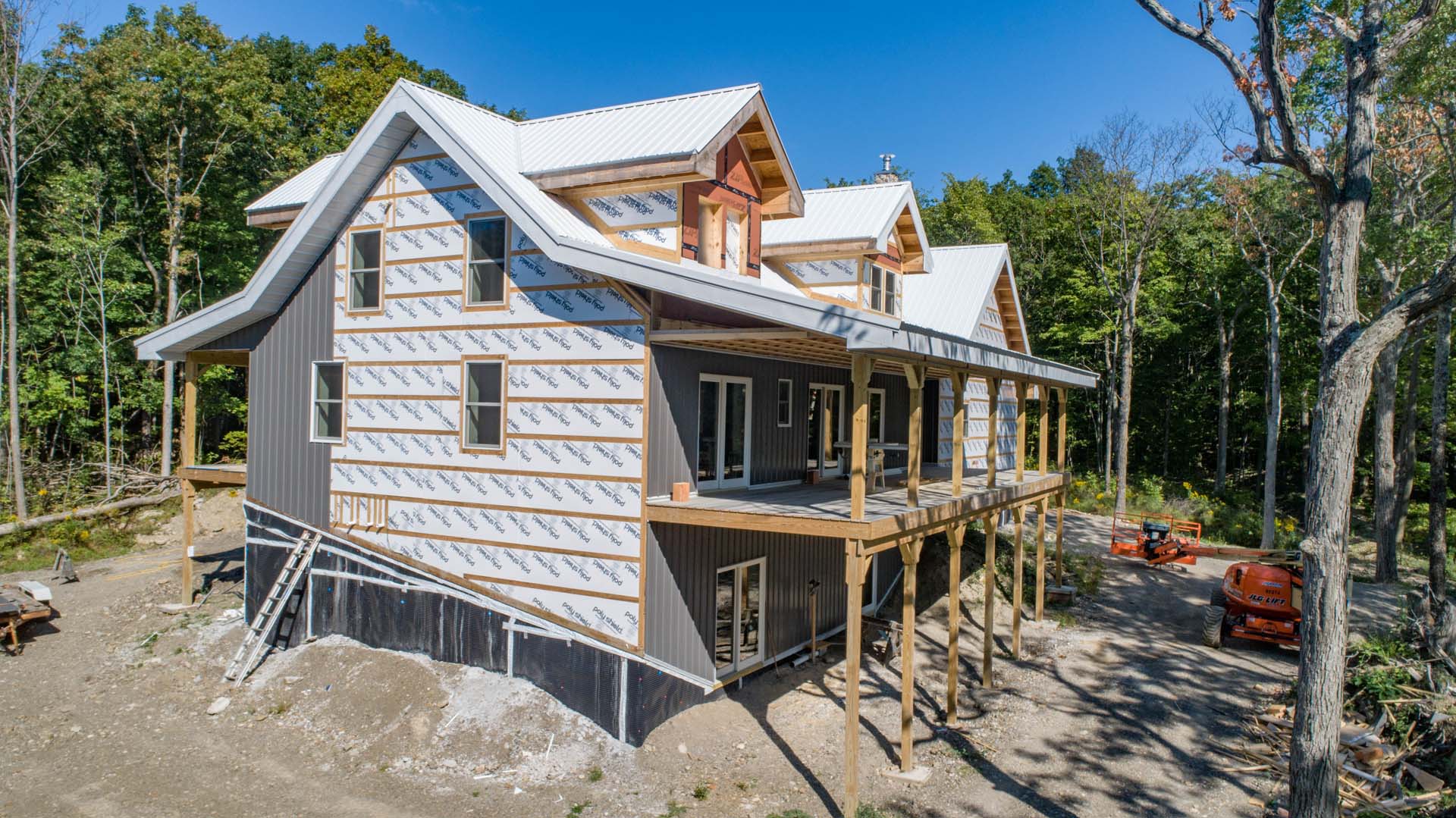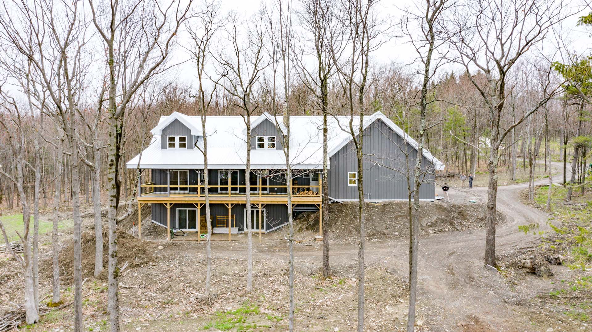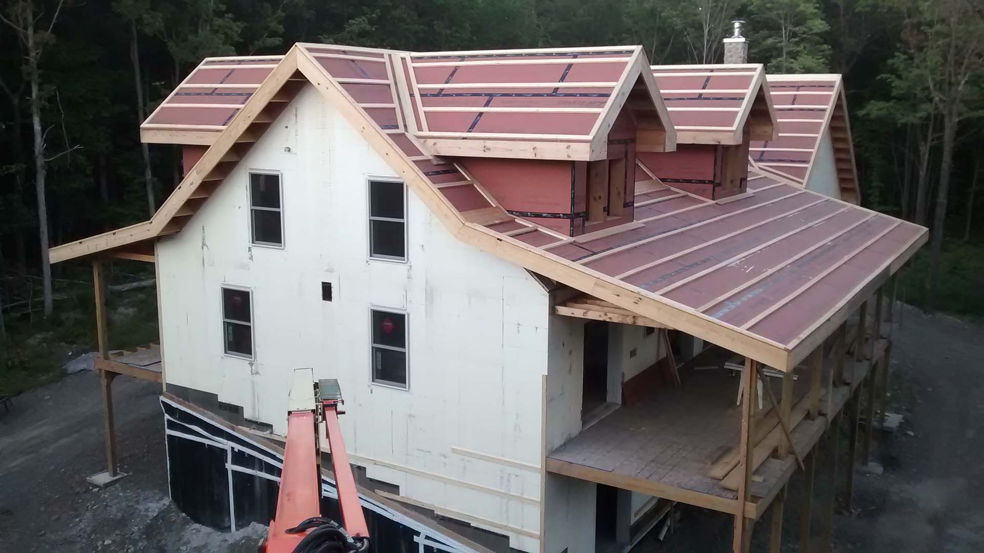 The design of the Stid Hill House includes a main living space that is distributed across the first floor with additional loft-style spare bedrooms on a second floor. To achieve low energy use, Victor used BuildBlock ICFs for the exterior walls, a closed-cell spray foam roof, and a high-efficiency fireplace as the main heating source. The home is equipped with a propane heater but is only used as a backup heat source on incredibly cold days. The use of these additional high-efficiency materials gives the home an estimated R-Value of R-60. To ensure that this house is as low-maintenance as possible, Victor integrated sheet metal siding and roofing to the home. This also provides the house with extra protection from the elements and resistance to insects and rodents. The interior is complete with beautiful custom cabinets (attached directly to the ICF walls) and wood trim work.