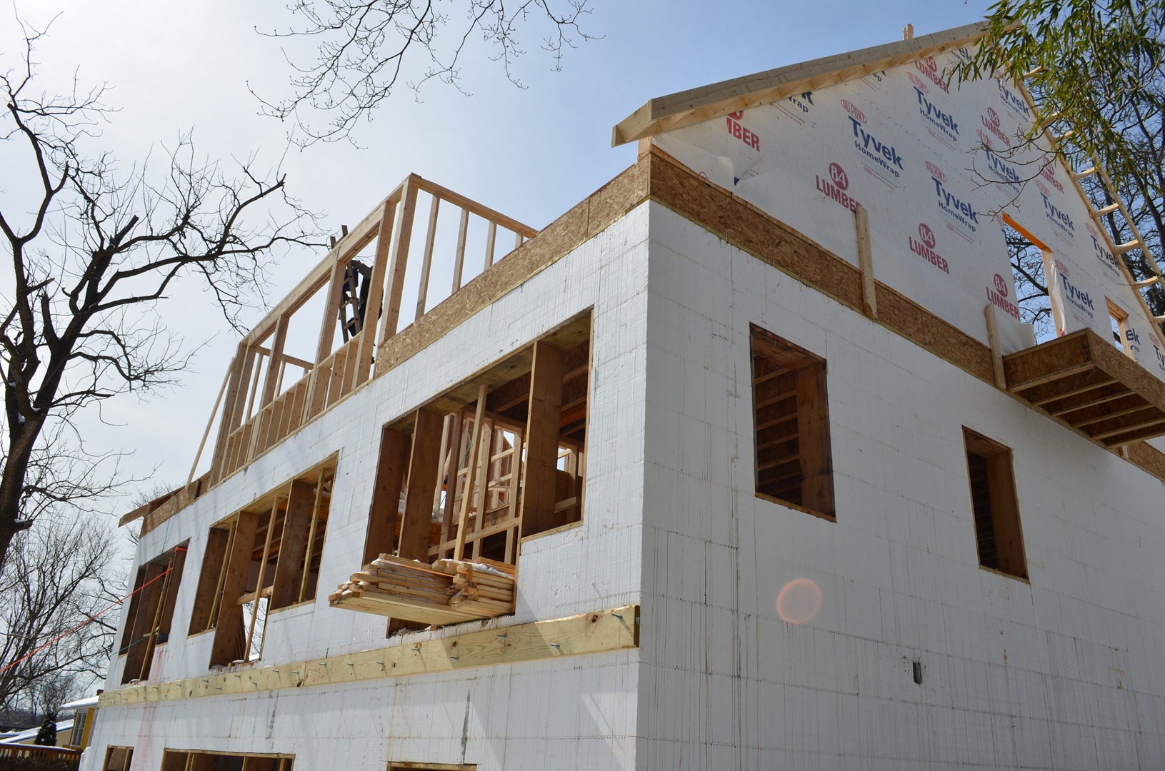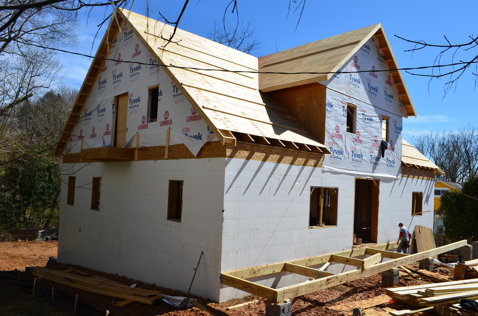 Green Casa Maryland is not only a feat of end-use efficiency but also in construction. The complexity of the project was increased by the fact that the home has 39 windows and doors increasing the amount of planning necessary for a successful build. Openings are marked on the plans and the foundation and cut, braced, and bucked as the walls go up. Moreover, the open design of the home requires special beams to support the second floor which was notched and cemented into the ICF walls.