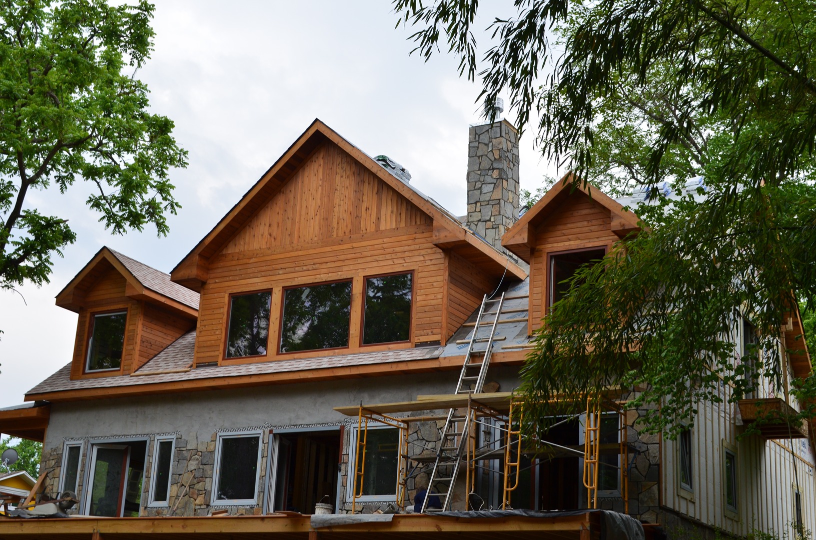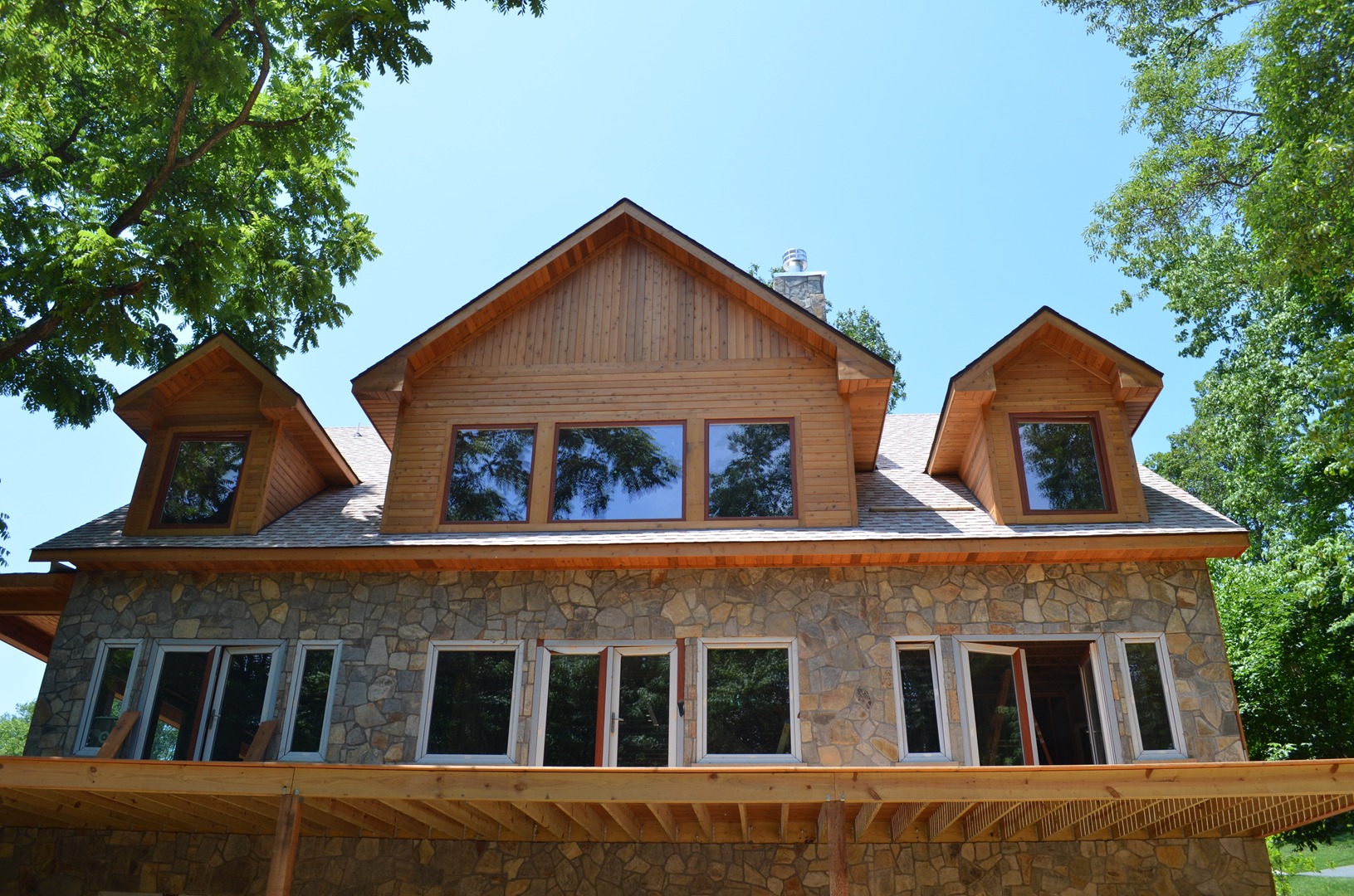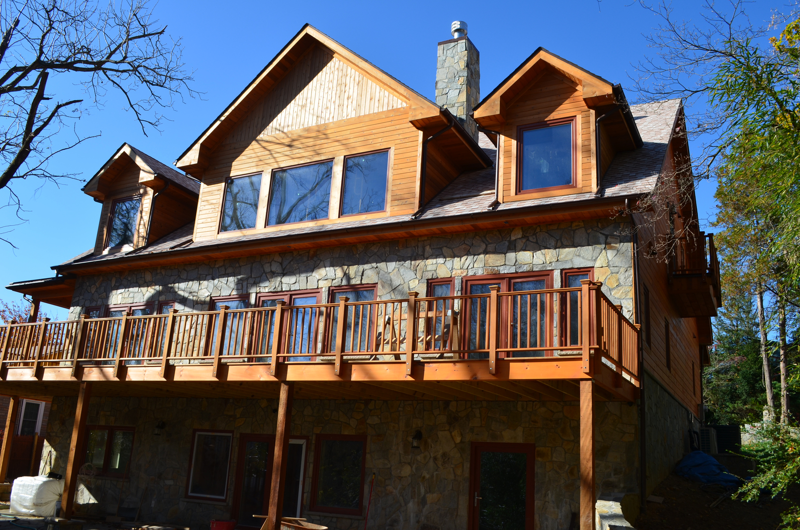 The design of the home is beautiful and unique. It is three stories and a bright open concept. The exterior is a combination of cedar and chocolate gray fieldstone. The interior is beautifully designed with 3 types of cedar. From the front, it is a simple lodge type design but from the back, it looks like a Swiss chalet. The home has won several awards including the “Excellence in Concrete” award for the innovative use of concrete and Helix in the ICF.