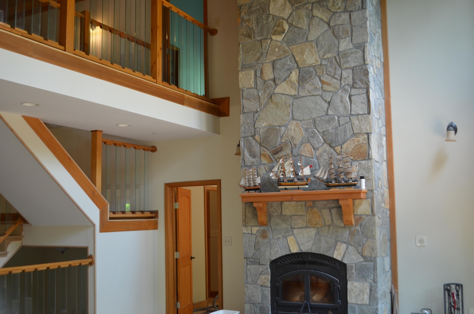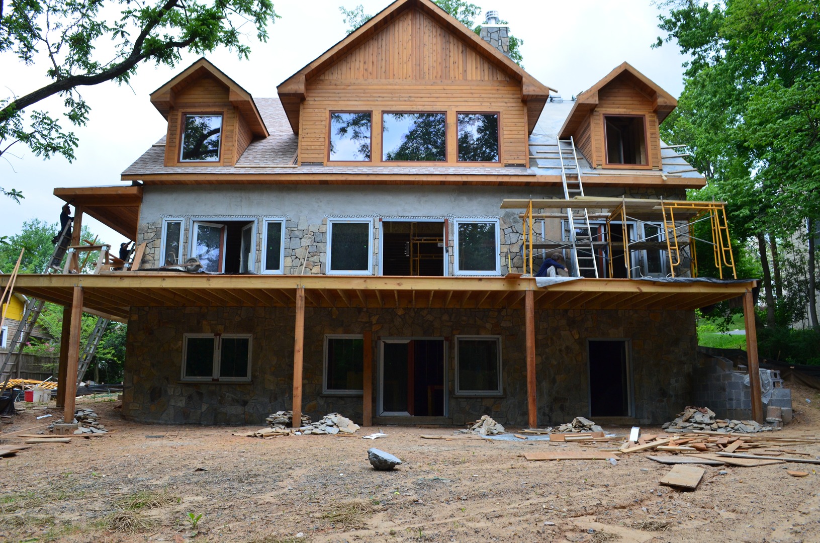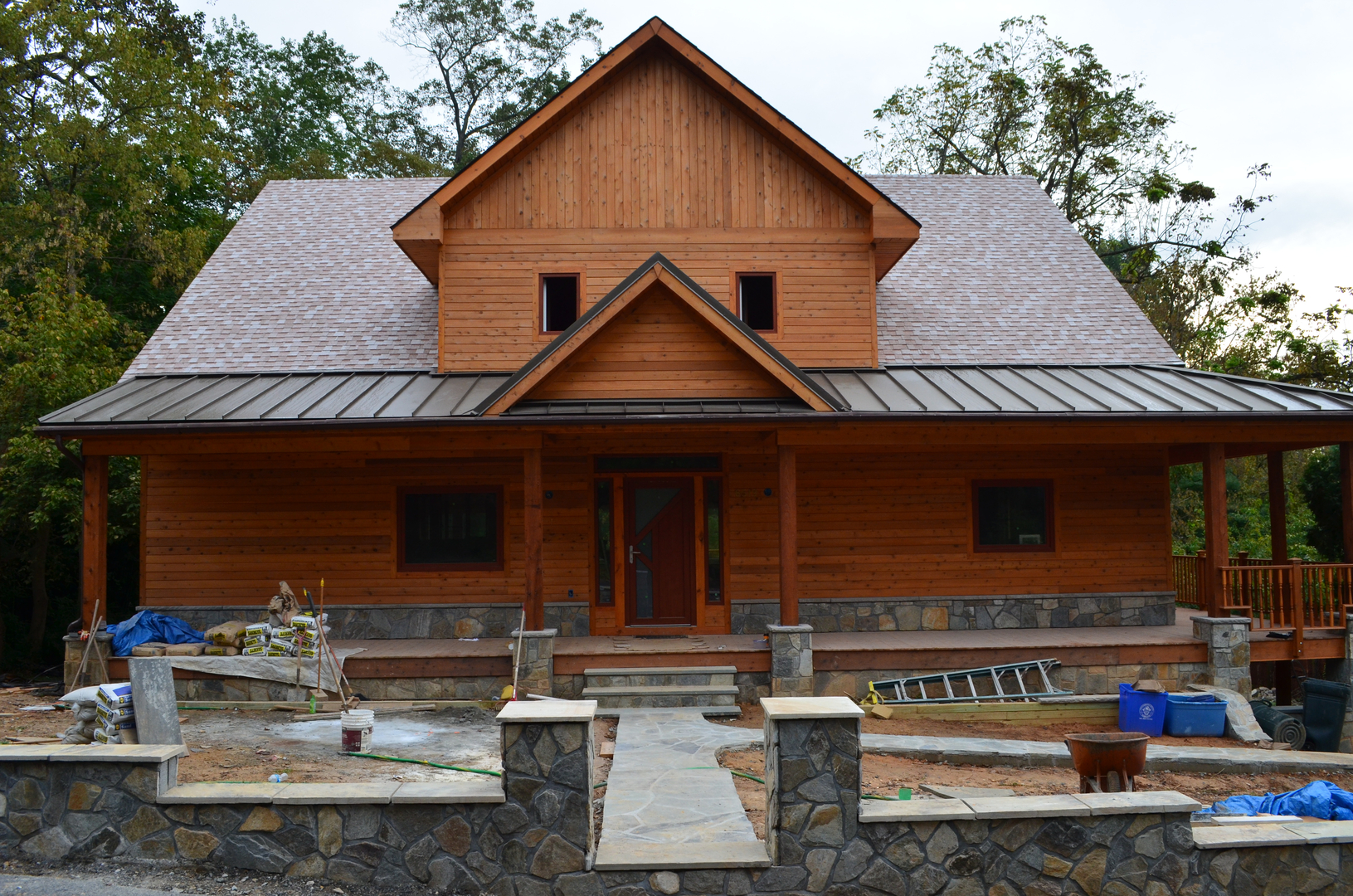 The design of the home is beautiful and unique. It is three stories and a bright open concept. The exterior is a combination of cedar and chocolate gray fieldstone. The interior is beautifully designed with 3 types of cedar. From the front, it is a simple lodge type design but from the back, it looks like a Swiss chalet. The home has won several awards including the “Excellence in Concrete” award for the innovative use of concrete and Helix in the ICF.