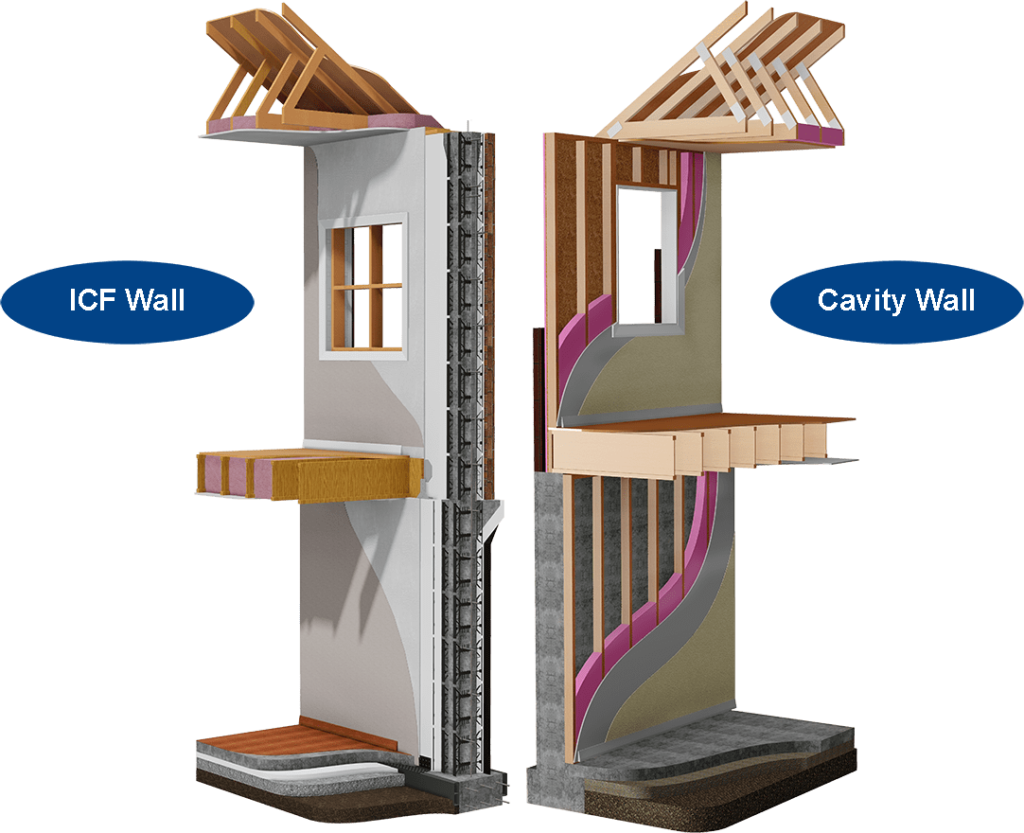 Cavity walls are usually wood or steel framed with insulation between framing members for the outside walls. Most single-family structures in the United States are built with cavity walls. While cavity walls may meet local and national building codes, but lack the performance and resilience when compared with ICF mass walls.
