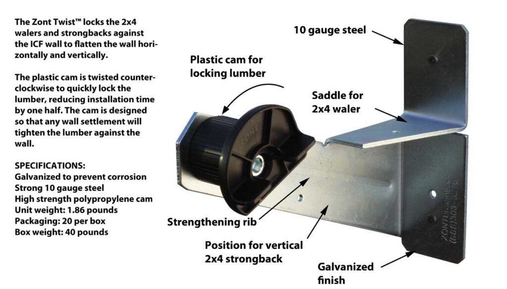 Zonts™ support 2×4 walers and strongbacks against the ICF wall thereby flattening the wall horizontally and vertically. Their 10 gauge thickness and galvanized finish guarantee long life.