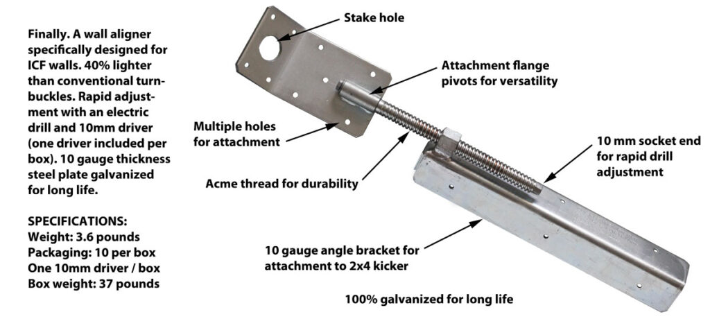 Finally. A wall aligner specifically designed for ICF walls. 40% lighter than conventional turnbuckles. Rapid adjustment with an electric drill and 10mm socket. 10 gauge thickness and galvanized finish guarantees long life.