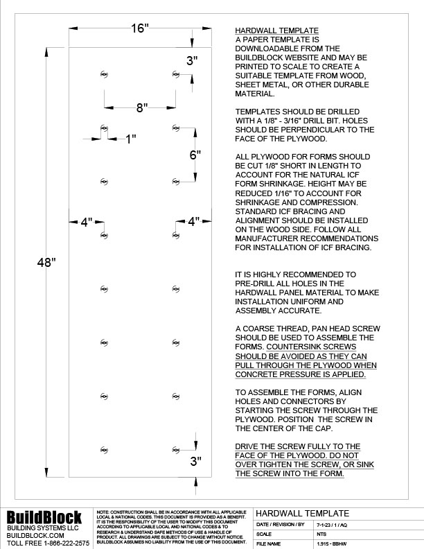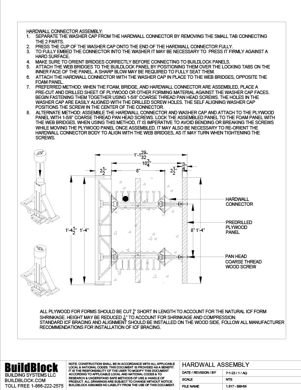 The new BuildBlock HardWall connector extends a BuildLock web bridge 2-1/2 inches to the edge of what is normally the EPS foam. The BuildBlock HardWall connector connects to any size of web bridge. The outer edge of the connector provides an attachment point for wood, cement board, or other suit able forming material. The end of the connector also contains a removable cap with a guide hole for screws. Once the wall is poured and the forming material is removed the cap may be left in place as an attachment point for wall finishes, or removed and the ½-in hole filled with patch or other material.
