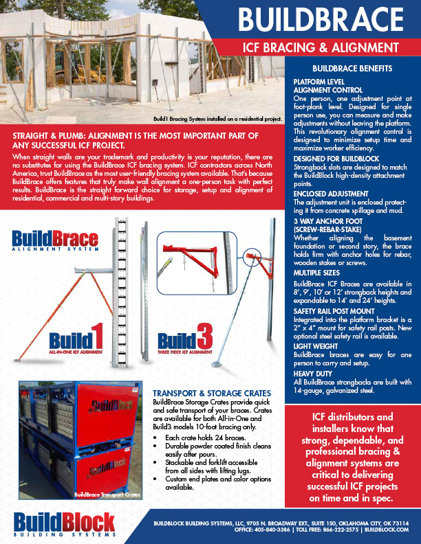 BuildBrace ICF Bracing & Alignment Systems are designed to deliver superior bracing, alignment, and a working platform at wall height for any ICF project.
