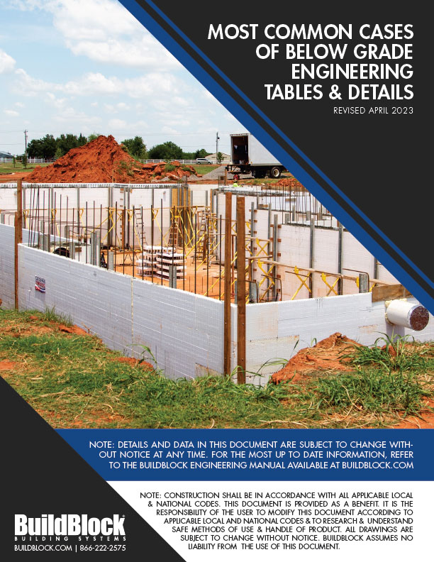 The BuildBlock Engineering Manual extends prescriptive and safe room engineering for greater wall heights above and below grade as well as making it easier to design FEMA 361 compliant safe rooms. The BuildBlock ICF Products & Safe Room Engineering Manual increases the scope of prescriptive engineering for BuildBlock ICF products. This document is intended to be used in conjunction with the PCA 100 Prescriptive Design of Exterior Concrete Walls for One- and Two-Family Dwellings when determining reinforcement for residential walls and as a reference for commercial engineering.